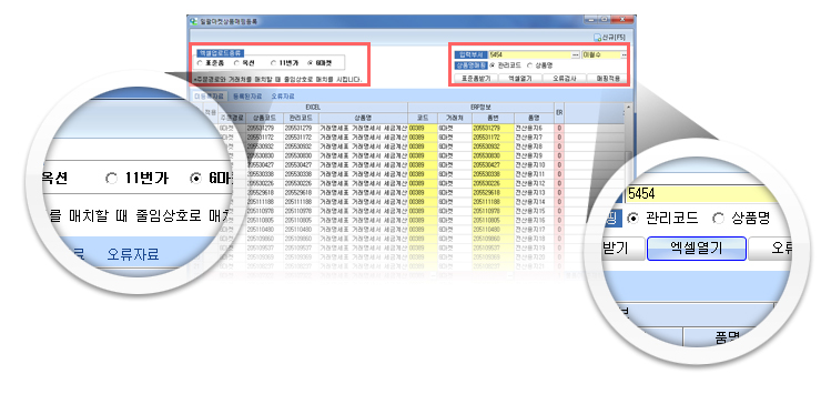 ¿ÀǸ¶ÄÏ¿¡¼ ´Ù¿î·Îµå ¹ÞÀº ¿¢¼¿ÆÄÀÏÀ» ÇÁ·Î±×·¥¿¡ ¹Ù·Î ¾÷·Îµå ÇÒ ¼ö ÀÖ´Â ¸Þ´º ÀÔ´Ï´Ù. ¢º ¼Õ½¬¿î »óǰ ¾÷·Îµå : °¢ ¿ÀǸ¶ÄÏ¿¡¼ ´Ù¿î·Îµå ¹ÞÀº ¿¢¼¿ÆÄÀÏÀ» ºÒ·¯µé¿© ¹Ù·Î ¾÷·Îµå ÇÒ ¼ö ÀÖ½À´Ï´Ù. °³ÀÎ ¿ÀǸ¶ÄÏÀÇ °æ¿ìµµ ±âº»ÆûÀ» ´Ù¿î¹Þ¾Æ ÀÛ¼º ÈÄ ¼Õ½±°Ô ¾÷·Îµå °¡´ÉÇÕ´Ï´Ù. ¢º ¹°Ç° ¾÷·Îµå ¸ñ·Ï ÀÚµ¿¿À·ù°Ë»ç : ¿¢¼¿·Î Àϰý¾÷·Îµå ÇϰíÀÚ ÇÏ´Â ¹°Ç°¸ñ·Ï¿¡ ¿À·ù »çÇ×ÀÌ ÀÖ´ÂÁö °ü¸®ÄÚµå ¶Ç´Â »óǰ¸íÀ» ±âÁØÀ¸·Î ¿À·ù°Ë»ç¸¦ ½ÇÇàÇÒ ¼ö ÀÖÀ¸¸ç ( ¿À·ù°¡ ÀÖÀ» °æ¿ì ºÓÀº»öÀ¸·Î Ç¥½ÃµÇ¾î ¿À·ù»çÀ¯¸¦ ½Ç½Ã°£À¸·Î È®Àΰ¡´É) ¹öưÇϳª·Î ´ÙÁß¹°Ç° Á¤º¸¸¦ ½Å¼ÓÇÏ°Ô ¾÷·Îµå ÇÒ ¼ö ÀÖ½À´Ï´Ù.